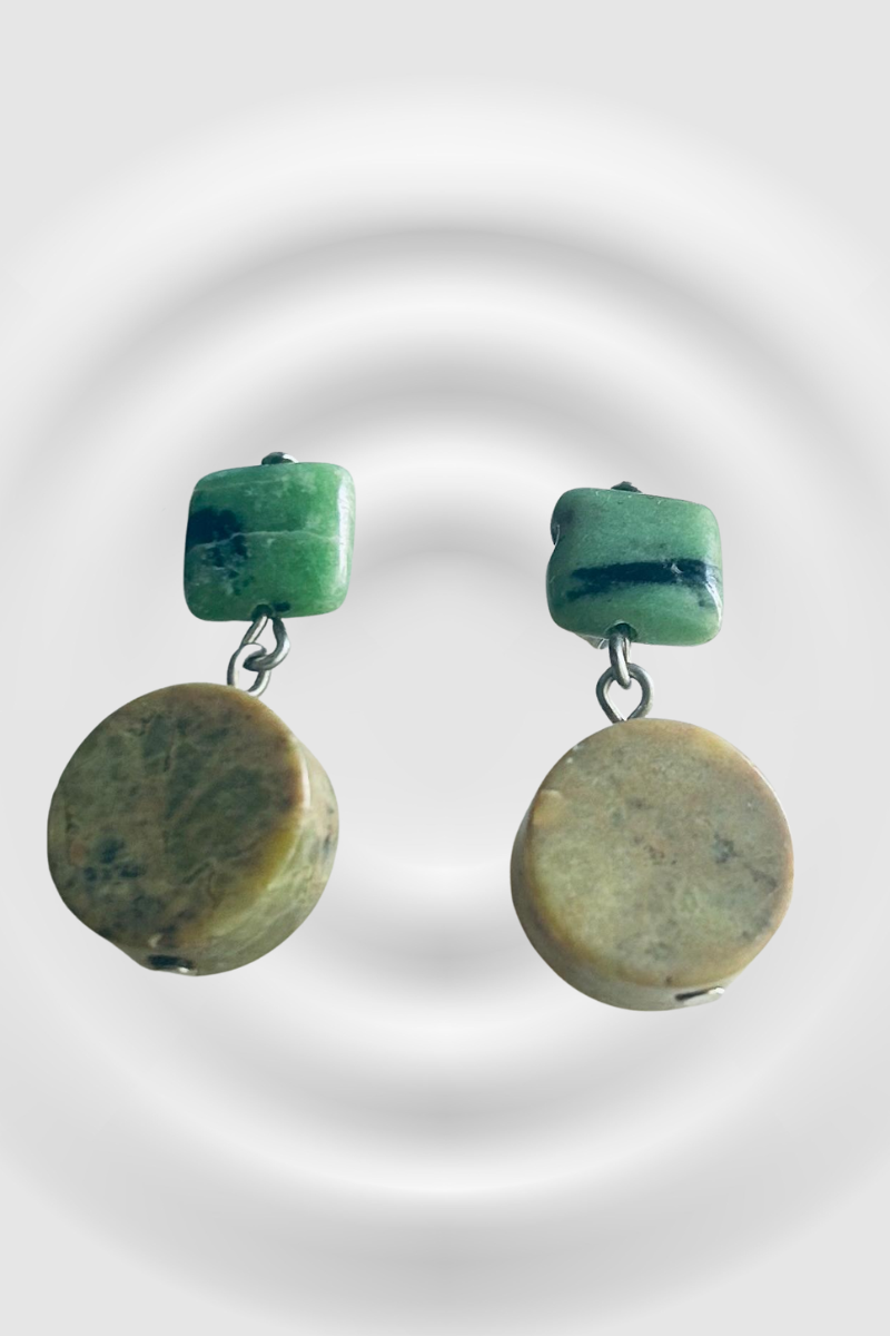 Pendiente realizado en tres piedras naturales: El Turquesa Verde el rubí y zoisita  que es una piedra que combina dos piedras en una: el rubí y la zoisita